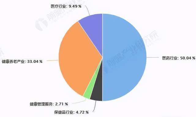 現階段,我國大健康產業主要以醫藥產業和健康養老產業為主,市場占比分別達到50.05%、33.04%;健康管理服務產業比重最小,只有2.71%。