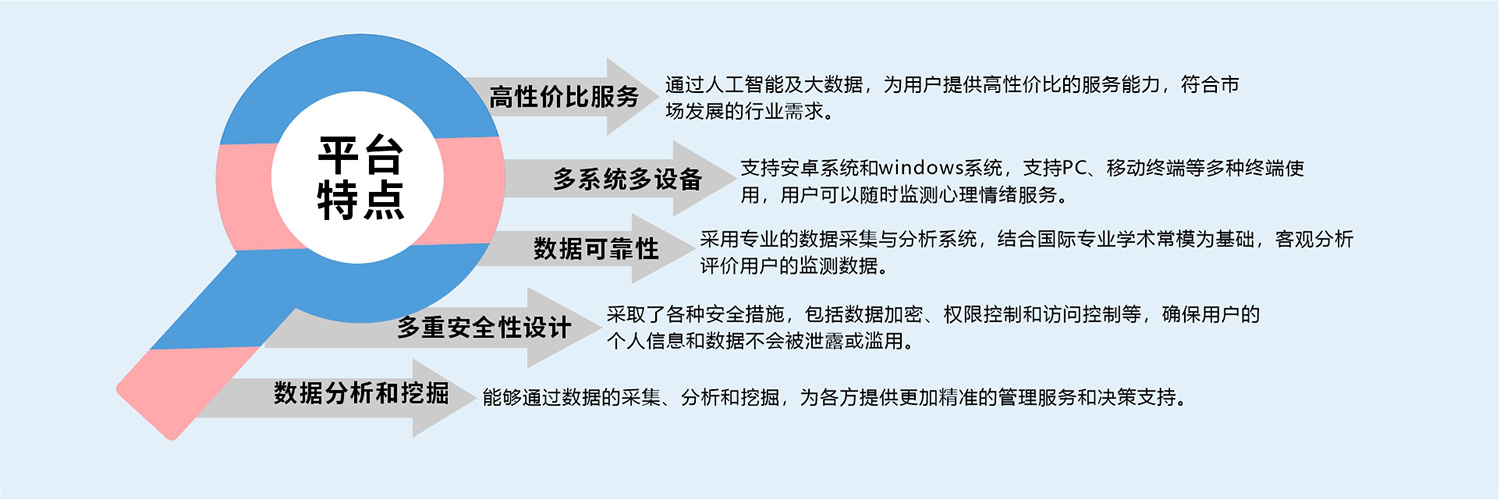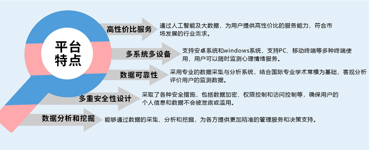 檢信SaaS心理情緒云平臺解決方案是一種創新的心理情緒監測一站式運營管理模式可以提供跨平臺、跨設備、跨地域的心理情緒監測管理服務。目前,檢信SaaS心理情緒云平臺解決方案針對市場特點,建立了中小學普教行業和企事業單位兩大獨立運營平臺,普教平臺針對教育的特點建立了專業的智能專家數據庫,企事業單位根據不同的職業特點為公務員、企業、醫生等提供專業的數據增值服務,已廣泛應用于教育.公園、企業事業等行業。